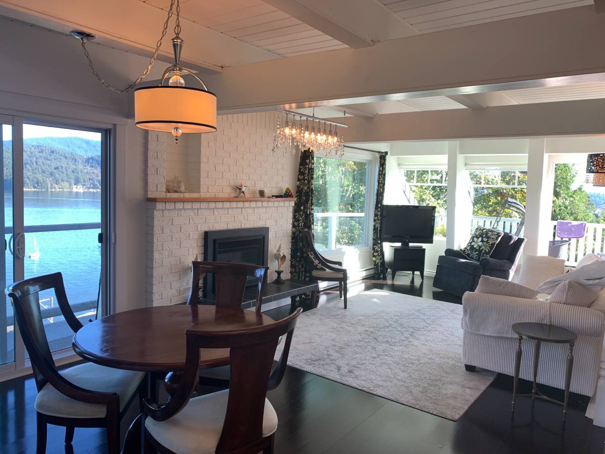 ✨Open dining and living area featuring a gas fireplace, bright south-facing windows, and a wrap-around deck showcasing extraordinary ocean views